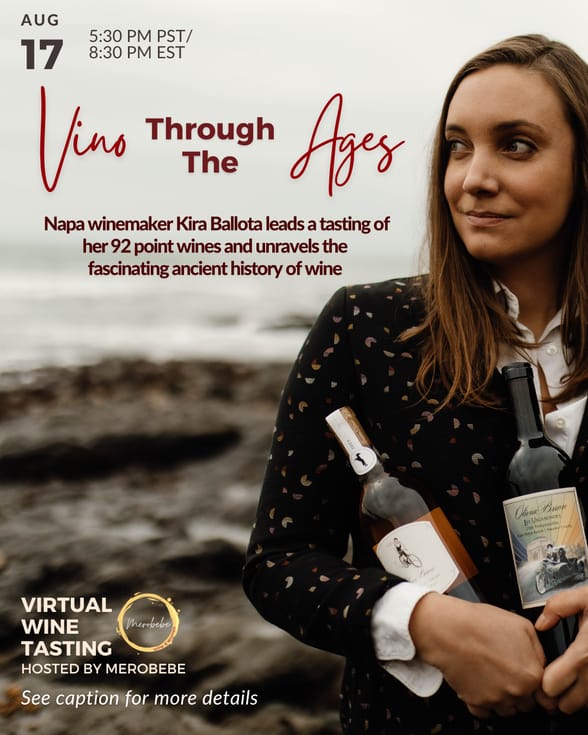 Iāll be joined by Napa Valley winemaker Kira Ballotta, one of our previous women in wine, who will be leading a tasting of two of her 92 point wines before diving into the fascinating ancient history of wine!