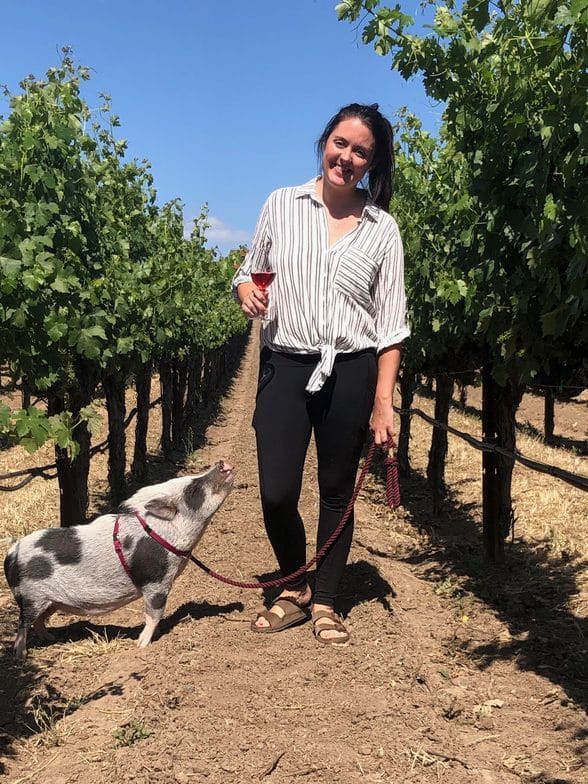 Alex takes a vineyard stroll with her pet pig, Pinot
