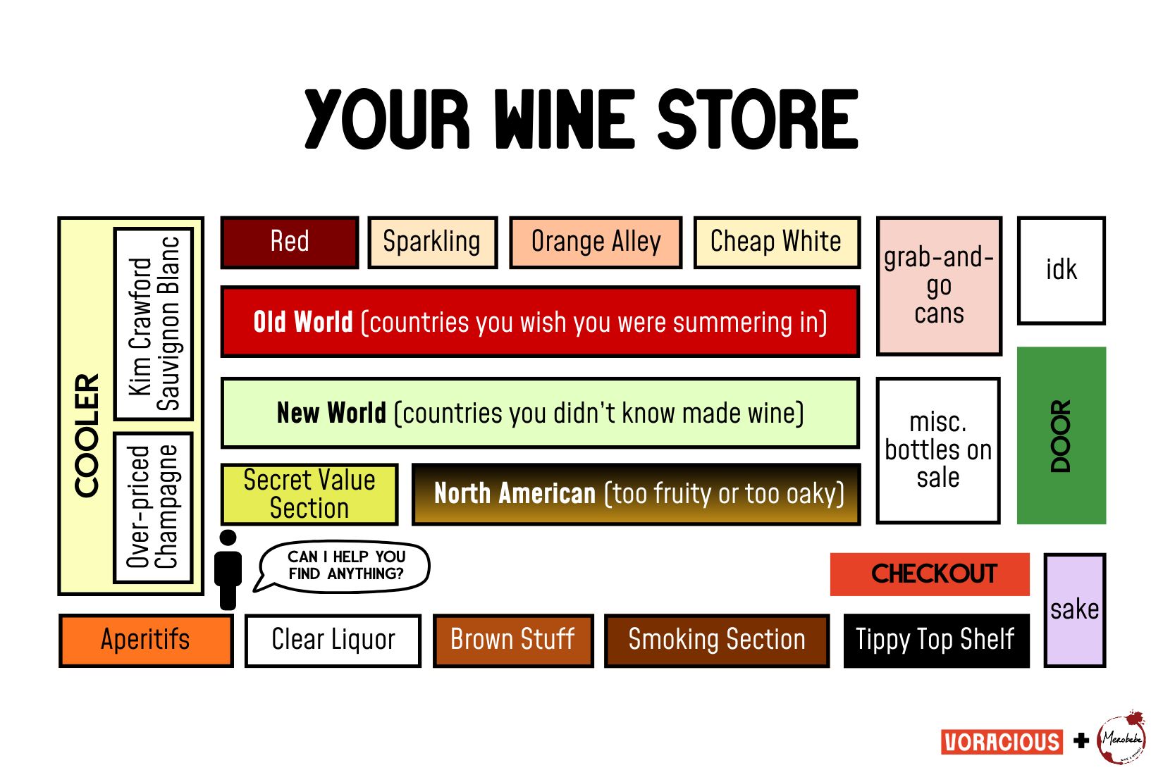 Pull out your map: stores are usually organized by color (white, orange, rose, red, sparkling), region, and varietal